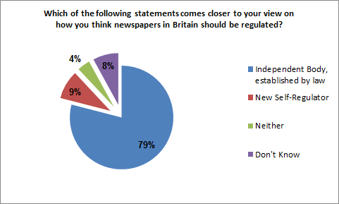 A story about the poll was published in the Guardian today.  It is interesting to note that the 79% figure is higher than the finding of a similar poll commissioned by Hacked Off two months ago which asked exactly the same question.  Between the two polls, several national newspapers have conducted intensive campaigns suggesting that tougher press regulation would inevitably threaten free speech.